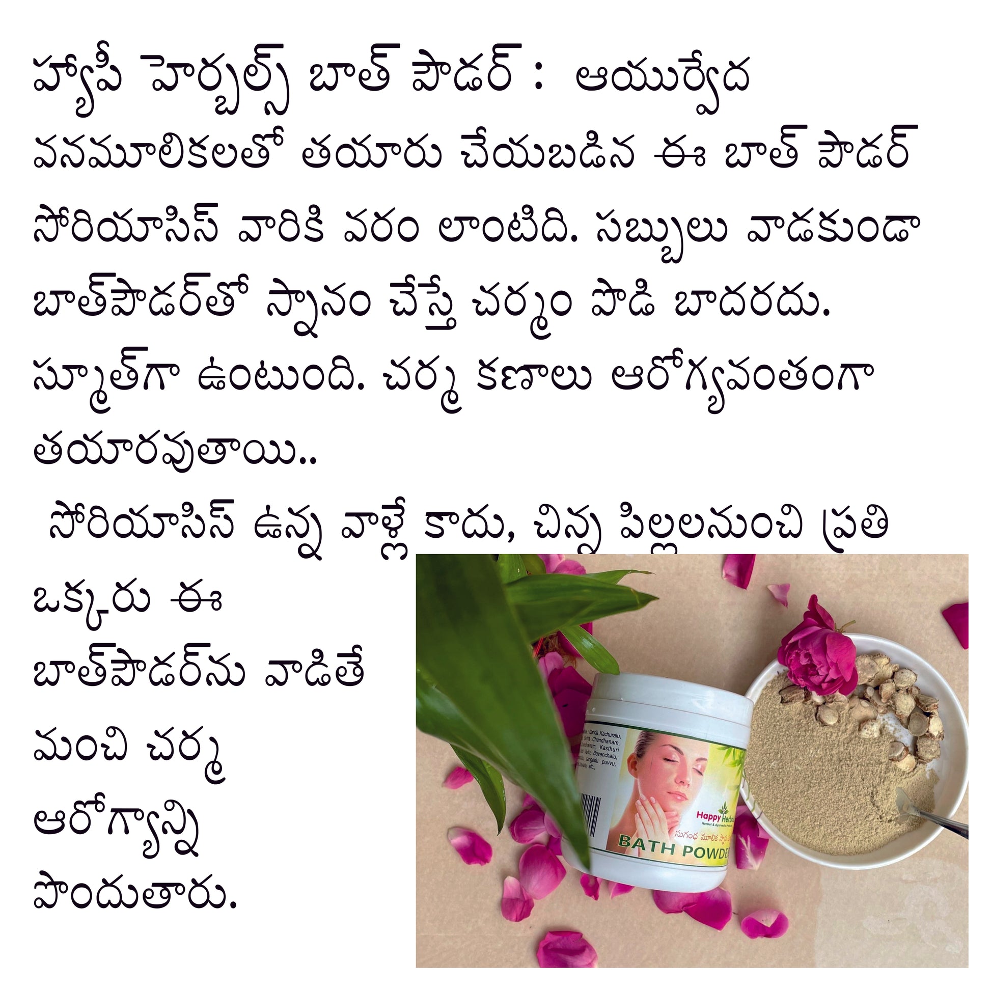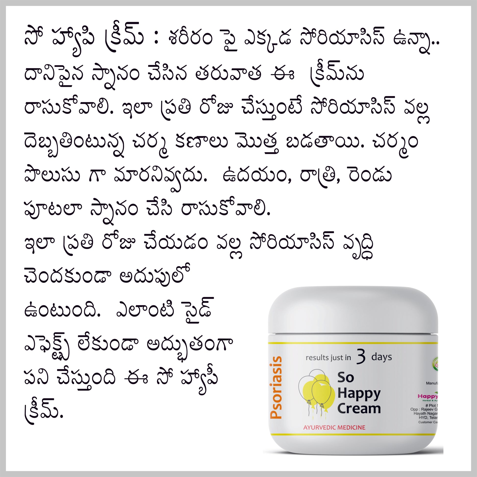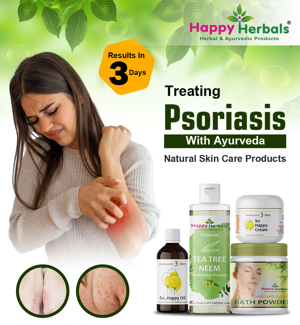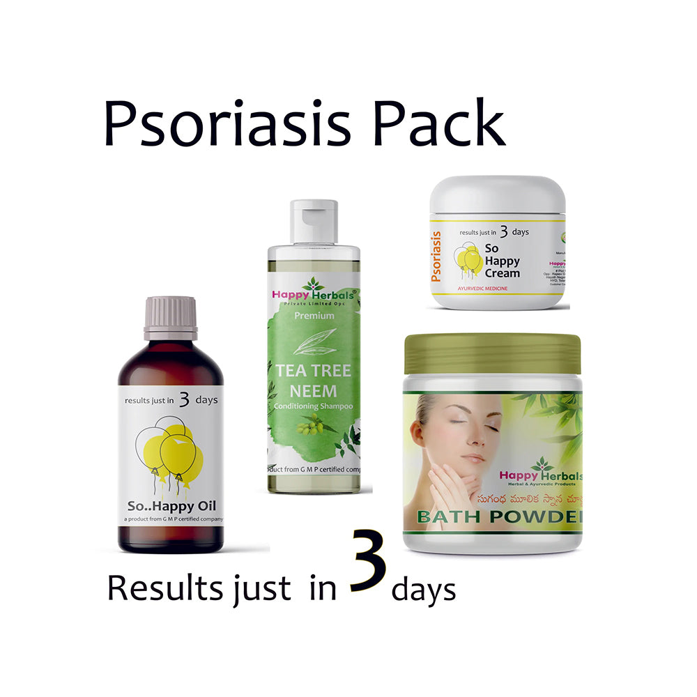 The Psoriasis Care Pack from Happy Herbals is a 100% Ayurvedic combination of four powerful external-use products made from herbal extracts and oils. Designed to support relief from Psoriasis, eczema, dry skin conditions, dandruff, and scalp infections — this set includes: Herbal Bath Powder, So Happy Cream, Tea Tree Neem Shampoo, and So Happy Oil.