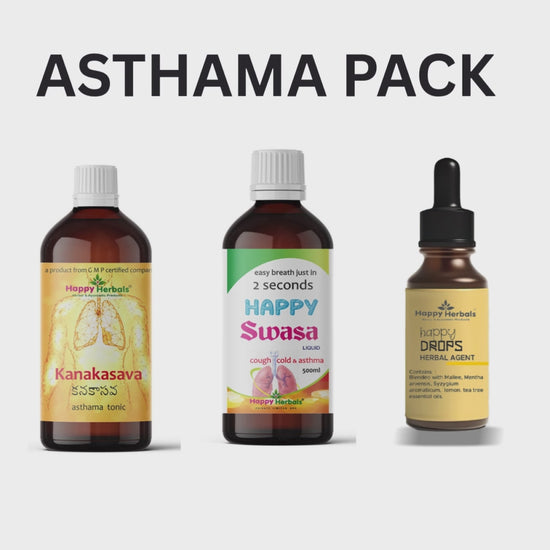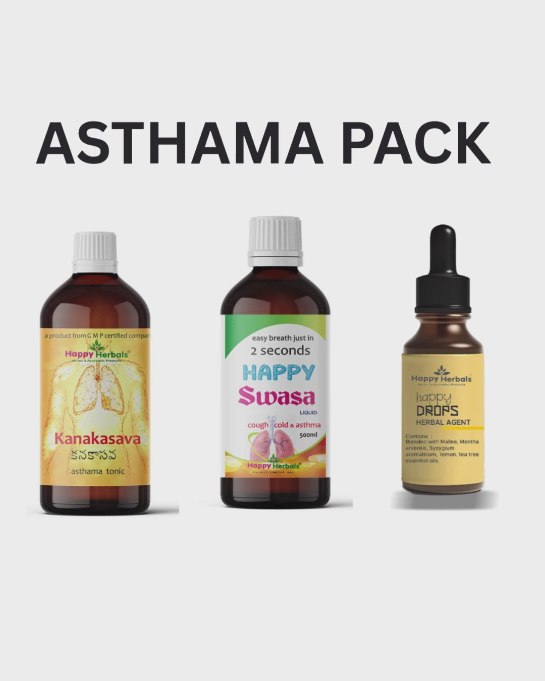 Happy Herbals presents the Asthma Pack, a powerful combination of time-tested Ayurvedic remedies crafted to support your respiratory system, clear nasal passages, and provide long-term relief from asthma, bronchitis, and breathing difficulties. This pack includes Happy Swasa Liquid, Kanakasava Syrup, and Happy Drops, all formulated with pure herbs known for their lung-strengthening and anti-inflammatory properties.